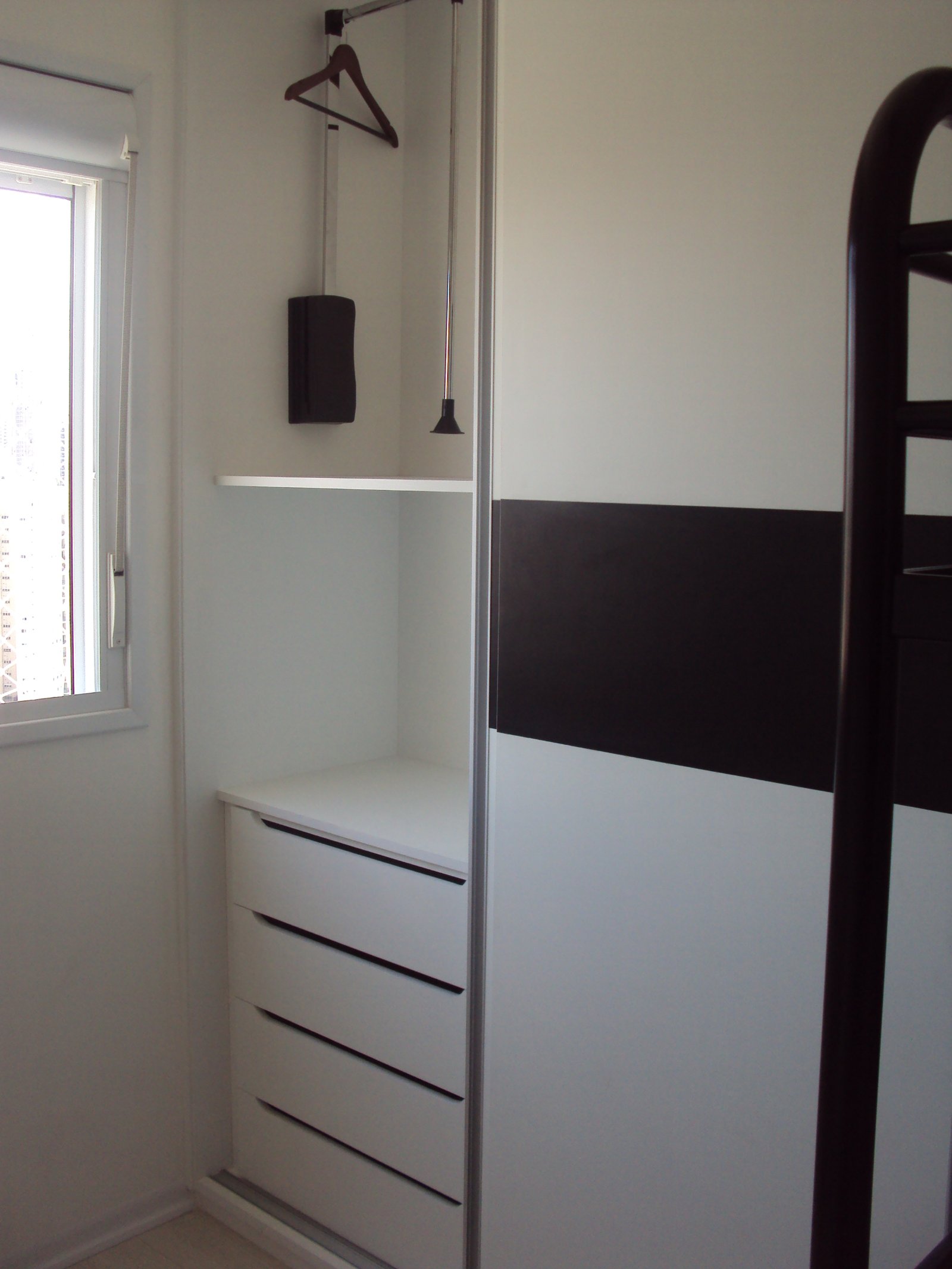 Armário de quarto com duas portas de correr em MDF branco com detalhes central preto, gaveteiro interno, prateleiras e cabideiro basculante, na região do Tatuapé.