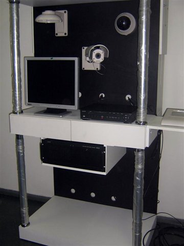 Stand para Sanyo da Moóca, para colocação de câmera de Vídeo para filmagem e acessórios, feita em fórmica branca e bastão de apoio em aço escovado.