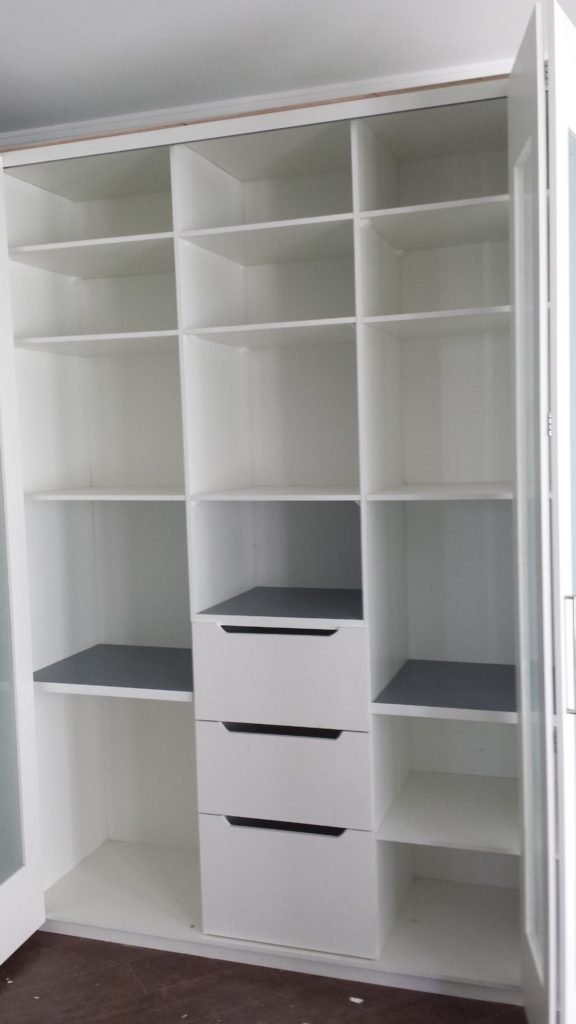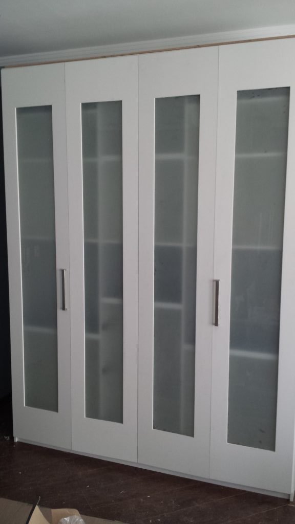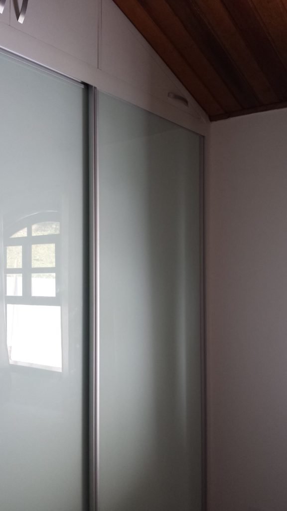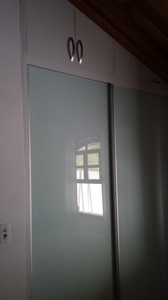 Lindo quarto com guarda roupa branco planejado e com portas com vidro esfumaçado. Feito para cliente na Mooca.